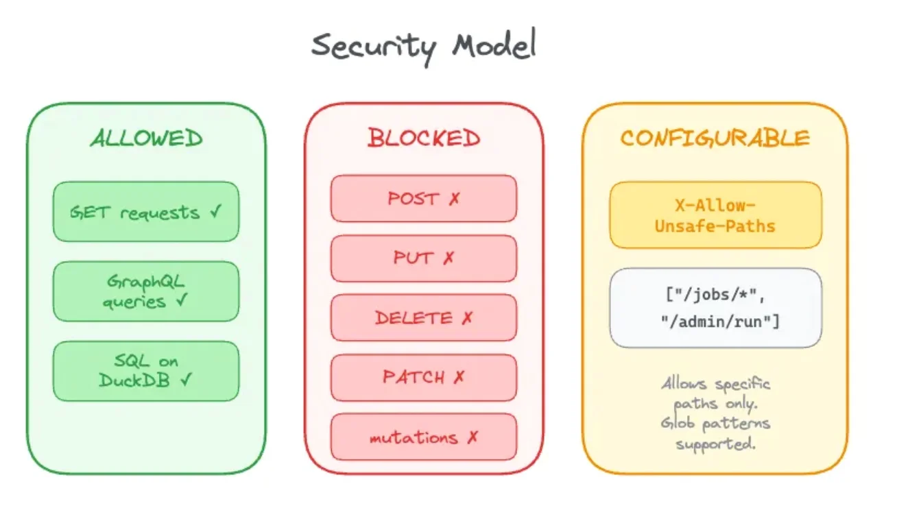 安全机制默认开启。API Agent 以只读模式运行,除非明确启用并加入内部工具白名单,否则不允许执行任何修改操作。