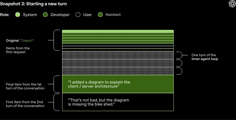 在 Codex 命令行工具中,会将助手消息展示给用户,并聚焦输入编辑区,以此提示用户轮到其继续对话。若用户做出回应,上一轮的助手消息以及用户的新消息均需附加至响应 API 请求的输入字段中,从而开启新一轮对话。同样,由于对话处于持续进行的状态,发送至响应 API 的输入内容长度也会不断增加。