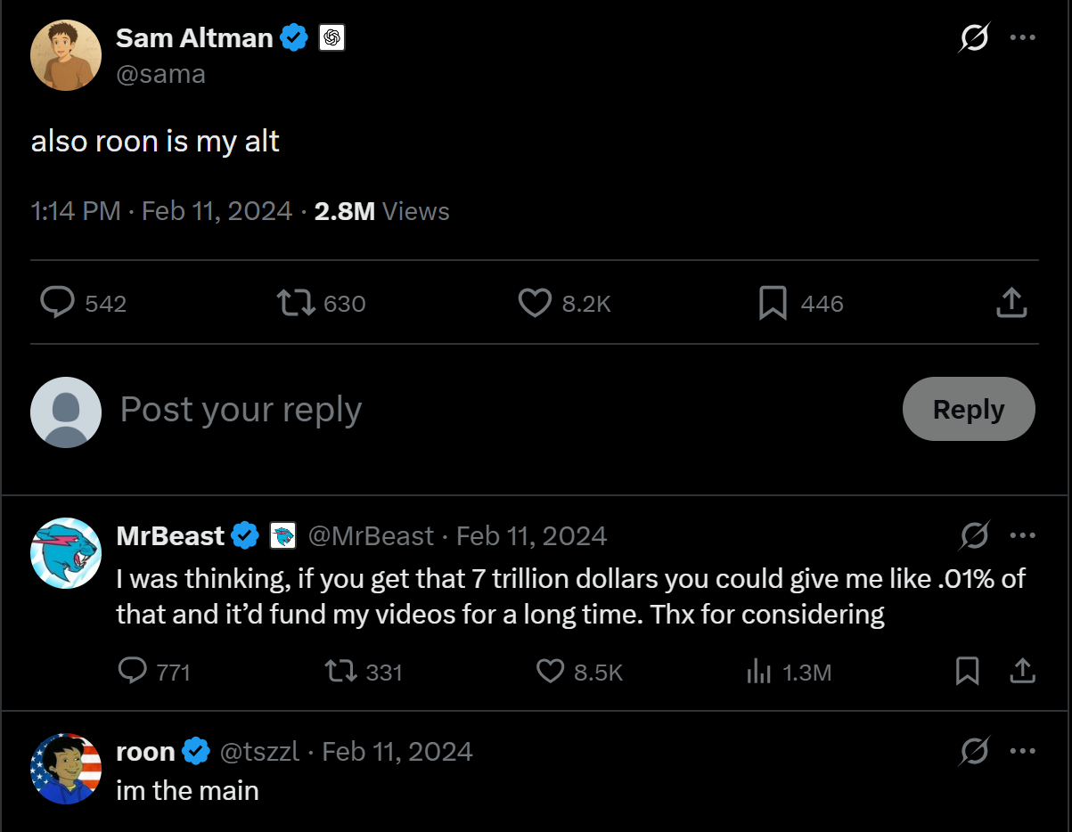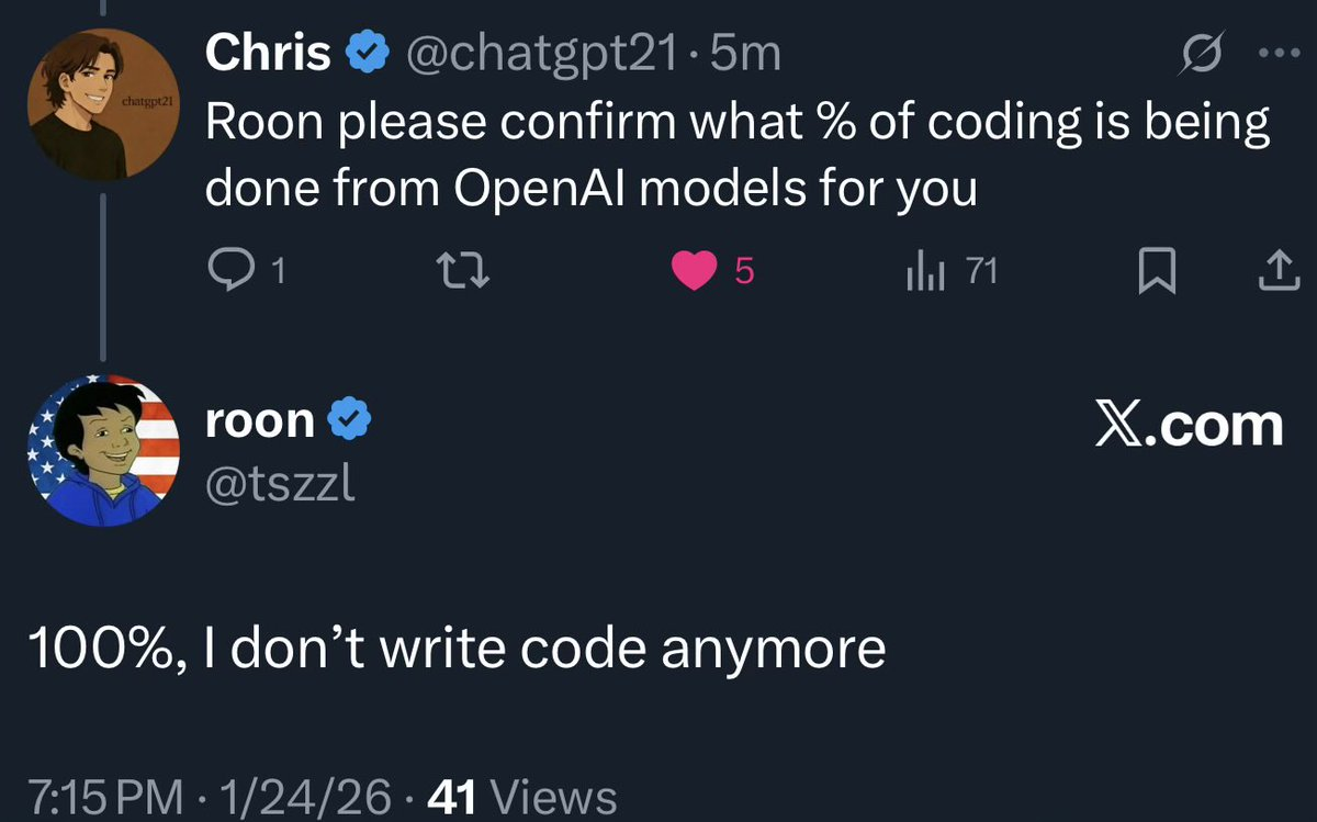 对于“你们有多少百分比的编码工作是基于 OpenAI 模型进行”的问题,roon 表示,“100%,我不再写代码了。”而此前,Sam Altman 曾公开发帖称,“roon 是我的小号。”