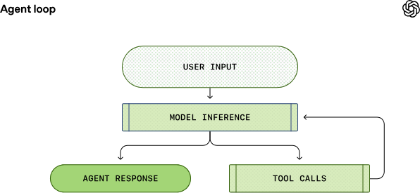 推理步骤完成后,模型会产生两种结果:(1)针对用户的原始输入生成最终回复;(2)要求智能体执行某项工具调用操作。若为第二种情况,智能体将执行该工具调用并将工具输出结果附加至原始提示词中。该输出结果会被用于生成新的输入内容,再次对模型进行查询;智能体随后会结合这些新信息,重新尝试完成任务。这一过程会不断重复,直至模型停止发出工具调用指令,转而生成面向用户的消息(在 OpenAI 的模型中,该消息被称为助手消息)。多数情况下,这条消息会直接解答用户的原始请求,也可能是向用户提出的跟进问题。