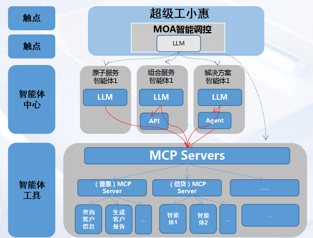 执行层(N 个垂直智能体):利用 MCP 服务网关调度存量工具,支持智能体按需调用