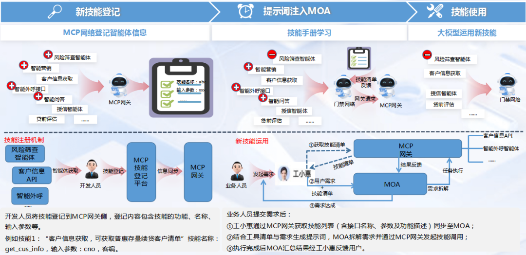 MCP 服务框架攻克存量系统复用难题。传统模式下,每接入一个新工具需定制化开发接口,耗时费力。MCP 创新采用“能力声明”机制——服务方仅需说明功能边界(如“输入企业名称,输出工商注册信息”),智能体即可通过语义理解自动发现并调用该服务。例如基于 MCP 服务提供的客户分析以及营销模板匹配能力,生成以客户为中心的精准营销方案。在客户分析时,快速聚合存量企业工商注册、客户画像、风险等信息,并协同企业自身经营交易数据、同业产品使用情况等分析数据,为营销客户生成定制化解决方案,形成“一户一案”能力。这一机制使新业务接入周期大幅缩短,为生态持续扩容奠定基础。