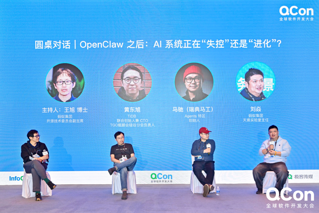 大会首日,在主论坛的压轴圆桌环节中,围绕“OpenClaw 之后:AI 系统正在“失控”还是“进化”?”主题,TiDB 联合创始人兼 CTO 黄东旭、蚂蚁集团开源技术委员会副主席王旭博士、 Agents 特区创始人马驰(瑞典马工)、 蚂蚁集团天宸实验室主任刘焱四位嘉宾围绕 AI 发展、应用、安全与责任等议题展开深入交流。