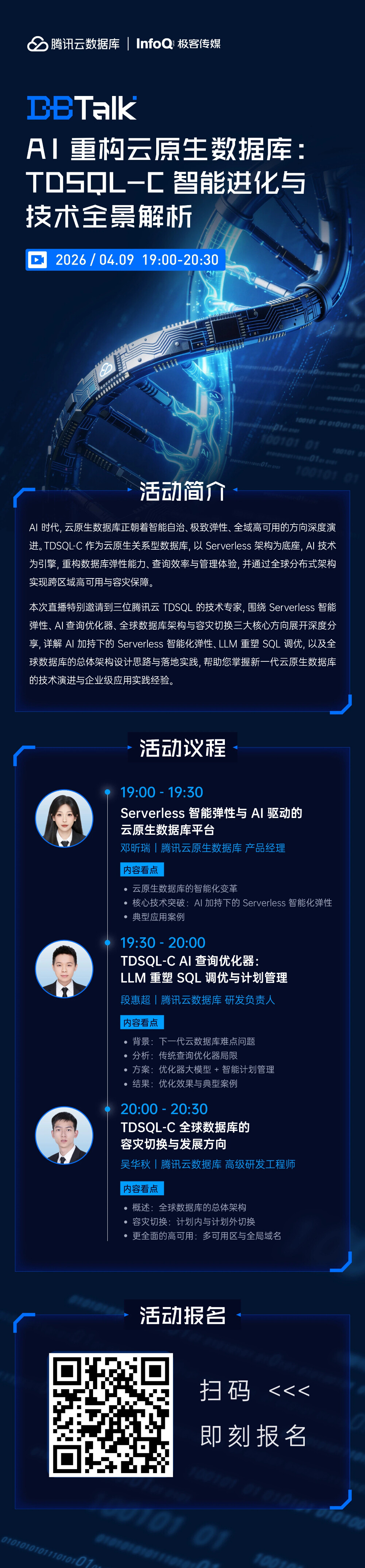 为了让更多开发者洞悉云原生数据库的技术演进路径,掌握 AI 赋能下数据库建设的核心方法,DBTalk 第二期特别策划「AI 重构云原生数据库:TDSQL-C 智能进化与技术全景解析」主题直播,邀请三位 TDSQL 核心技术专家,全方位拆解 TDSQL-C 的技术内核与实践经验。