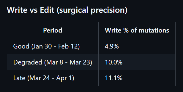 报告称,研究力度的下滑始于 2 月中旬,与估算思考深度下降 67%的时间段完全吻合。同时,整文件写入的使用量翻倍,模型越来越倾向于重写整个文件,而非进行精准的局部修改;这种方式速度更快,但会丧失精确性与上下文感知能力。