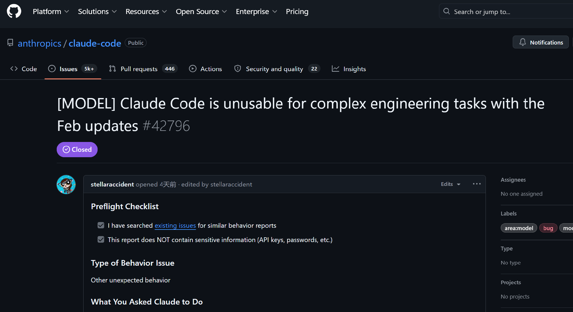 溯源之后我们发现,这一言论最早是在一位开发者在 Claude Code 的 Github 主页上提交的 issue,且附上的分析报告基于挖掘了三个月的 Claude 会话日志数据得出,包含的角度及内容都十分详尽。