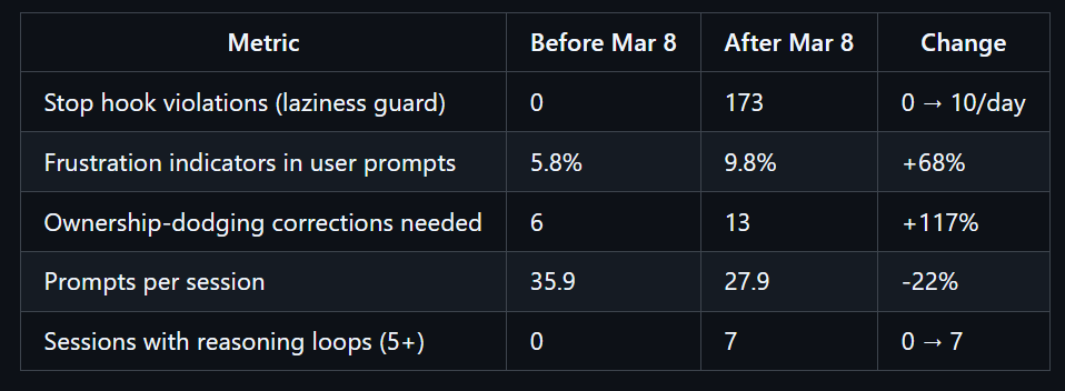 三是行为影响,这些可量化的质量指标均在开展思考分析之前,基于 18000+条用户提示词独立计算得出。其专门编写了拦截脚本(stop-phrase-guard.sh),用于自动检测模型回避责任、过早终止任务、反复请求授权确认等行为。该脚本在 3 月 8 日之后的 17 天内触发了 173 次,而在此之前触发次数为零。