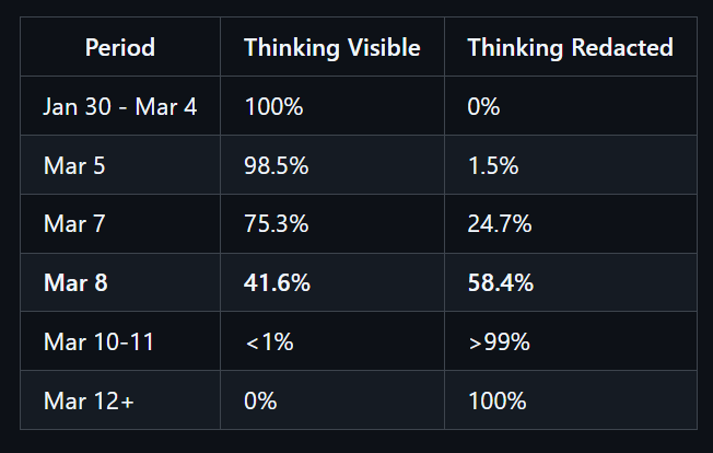 一是思考内容屏蔽时间线与质量下降高度吻合,这基于会话 JSONL 文件中的思考模块分析。此次质量下降问题于 3 月 8 日被独立上报,而这一天恰好是 redacted thinking 占比突破 50%的日期,其上线节奏(一周内从 1.5%逐步升至 25%→58%→100%)与分阶段灰度发布的特征完全吻合。