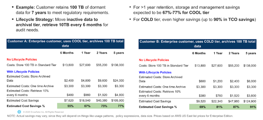 在 Snowflake,我们秉持化繁为简的理念。为应对这些挑战,我们欣然宣布:存储生命周期策略(Storage Lifecycle Policies)现已正式提供。该功能提供了一种简单、自动化的方式来管理数据生命周期,能帮助你大幅降低休眠数据的存储成本(降幅达 55%-90%),并以最低的运营开销简化合规流程。