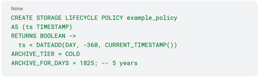 存储生命周期策略是一种模式级对象,可让你自动从标准 Snowflake 表中归档或删除数据。这些策略在行级别应用,能基于定义的时间线对要归档或删除的特定数据进行精细控制。你只需定义一个简单的策略表达式,剩下的工作由 Snowflake 负责——它会在共享计算资源上每天自动运行该策略。