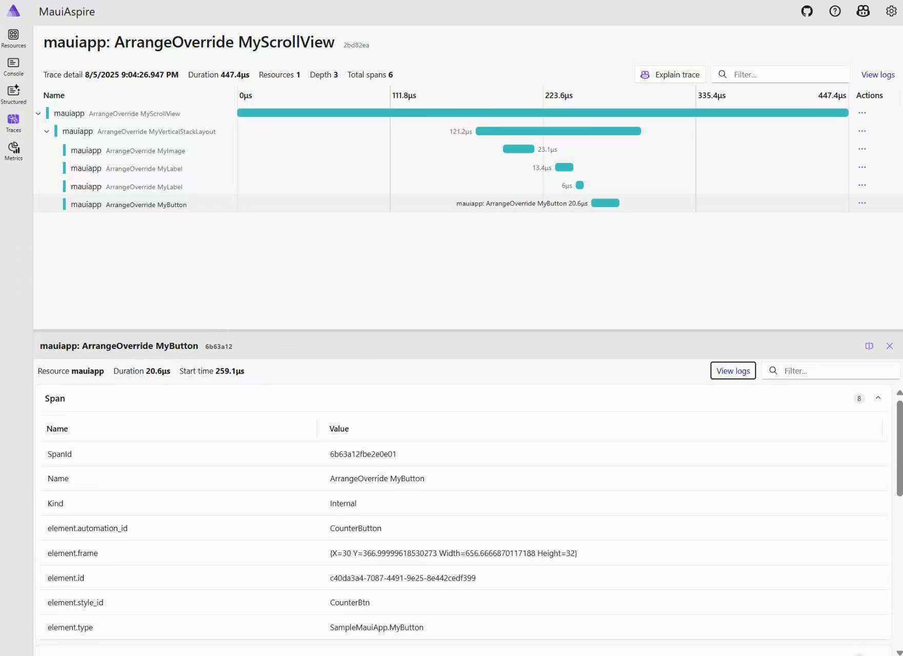 。这些原语发出与.NET Aspire 和 OpenTelemetry 仪表板集成的跟踪事件和性能计数器,实现了对布局测量和排列成本的实时可见性。该工具被实现为围绕 IView.Measure()