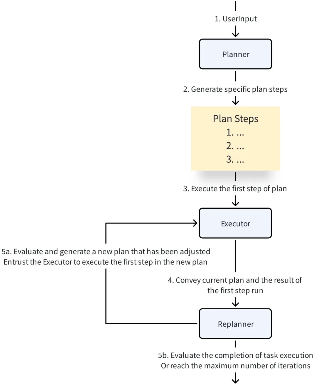 - Replanner:评估执行进度,决定是修正计划继续交由 Executor 运行,或是结束任务。