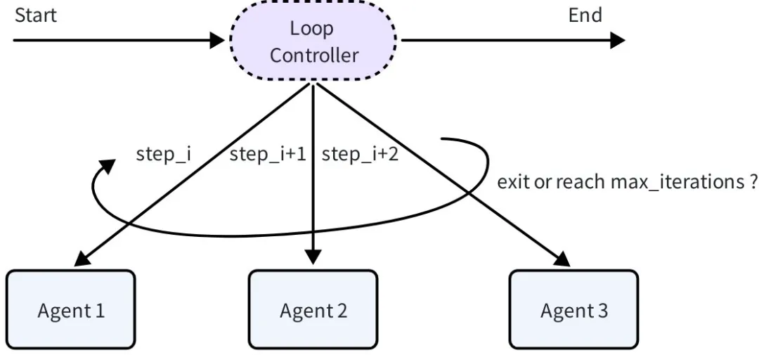 - Loop Agent: 将配置中注册的 Agents 按顺序依次执行并循环多次,运行遵循以下原则: - 循环执行:重复执行 SubAgents 序列,每次循环都是一个完整的 Sequential 执行过程; - 运行结果累积:每次迭代的结果都会累积,后续迭代的输入可以访问所有历史信息; - 条件退出:支持通过输出包含 - ExitAction的事件或达到最大迭代次数来终止循环,配置- MaxIterations=0时表示无限循环。