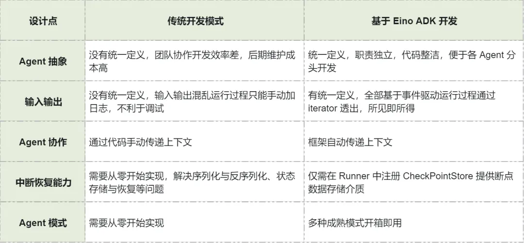 为此,Eino ADK(Agent Development Kit)应运而生,为 Go 开发者提供了一套完整、灵活且强大的智能体开发框架,直接解决传统开发中的核心难题。