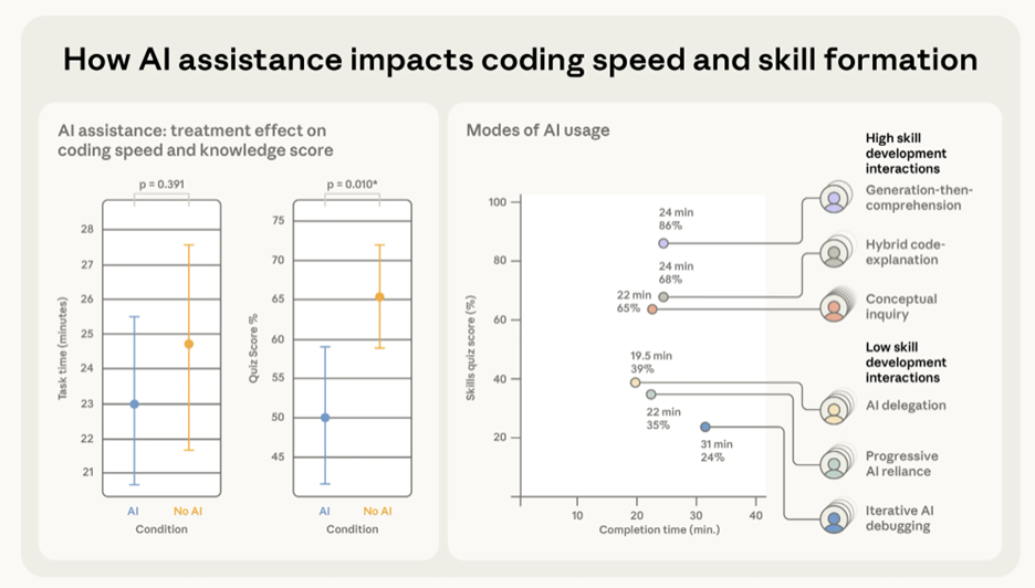 Anthropic 近日发布了一项随机对照试验,结果显示,使用 AI 编程辅助工具的开发者在理解能力测试中的得分比手动编程的开发者低 17%,且其生产力方面的提升未达到统计显著性。在对 52 名初级工程师的研究中,研究人员发现了明显的分化:将 AI 用于概念性问题的开发者测试得分达到或超过 65%,而将代码生成任务委托给 AI 的开发者得分则低于 40%。