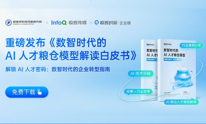 基于此,极客邦科技提出了“数智时代的 AI 人才粮仓模型”,旨在为企业构建一个系统、全面的人才培养和布局框架,该模型明确了数智时代下 AI 人才的核心能力要求和岗位设置。2024 年 4 月,在 QCon 大会(北京)上,极客邦科技发布了《数智时代的 AI 人才粮仓模型解读白皮书(2024 版)》(以下简称《白皮书》),从政策 + 行业变革等时代背景、企业需求、AI 价值、AI 人才模型及人才培养五个方面对“数智时代的 AI 人才粮仓模型”进行了深度解读,为企业提供一个清晰、可操作的 AI 人才布局指南,帮助企业快速构建起适应数字化时代需求的 AI 人才梯队,在激烈的市场竞争中占据先机。