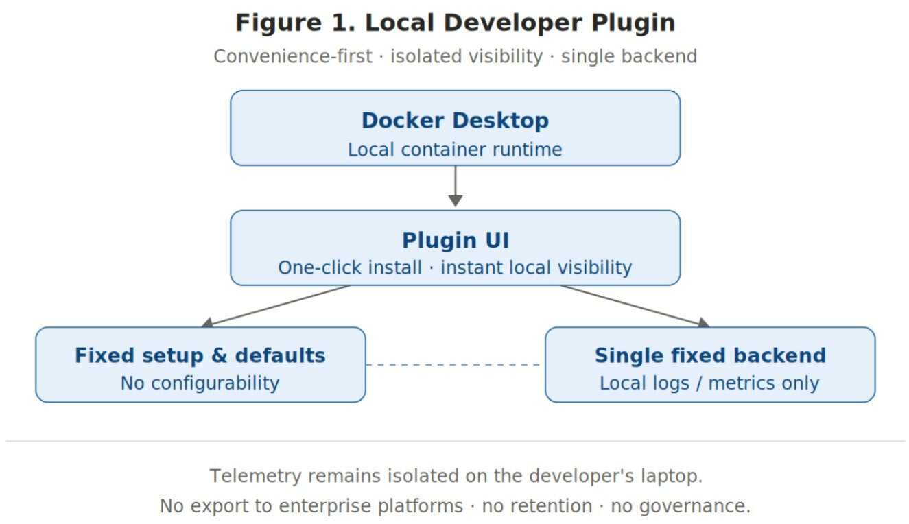 图 1:本地开发插件可在 Docker Desktop 中提供即时可见性,但遥测数据仍然局限于开发人员的笔记本电脑——既未导出至企业平台,也无数据保留策略,更缺乏相应的治理控制措施。