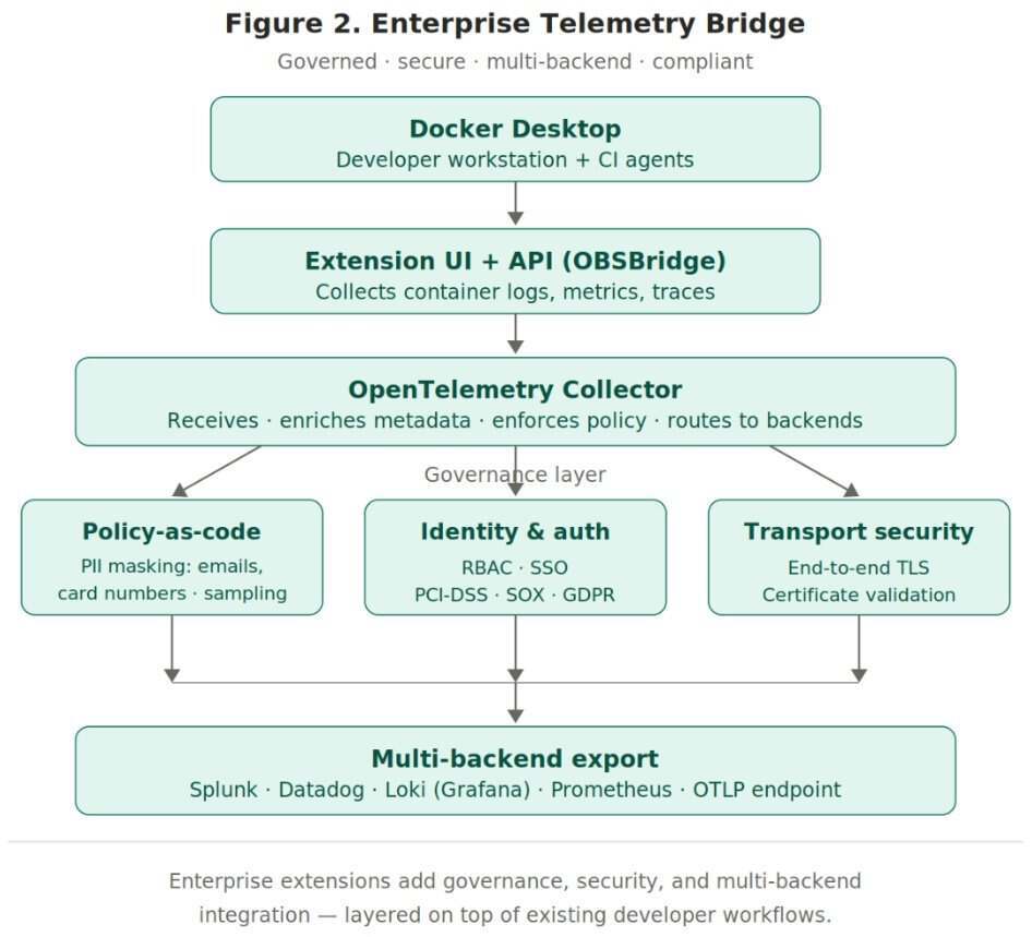 Docker 扩展功能让开发人员在日常工作流程中可以更轻松地获得可观测性。然而,企业环境需要的不仅仅是本地仪表板和可以快速获取的调试洞察。一旦遥测数据需要从笔记本电脑传输到企业后端,就必须确保其安全性、受到有效管理,并与组织现有的监控平台进行集成。