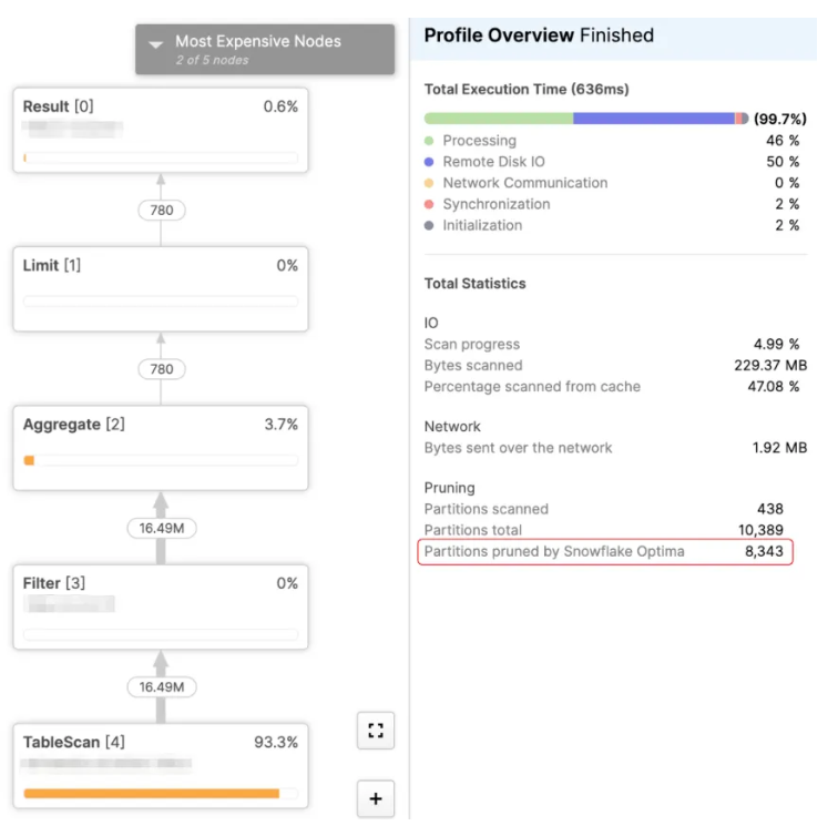 当你查看 Query Profile 选项卡时,打开 Statistics 面板。你会看到一行名为 Partitions pruned by Snowflake Optima 的数据。它会告诉你,有多少数据分区因为 Optima 在执行查询时被自动跳过,由此你能很直观地看到 Optima 对性能提升的贡献。
