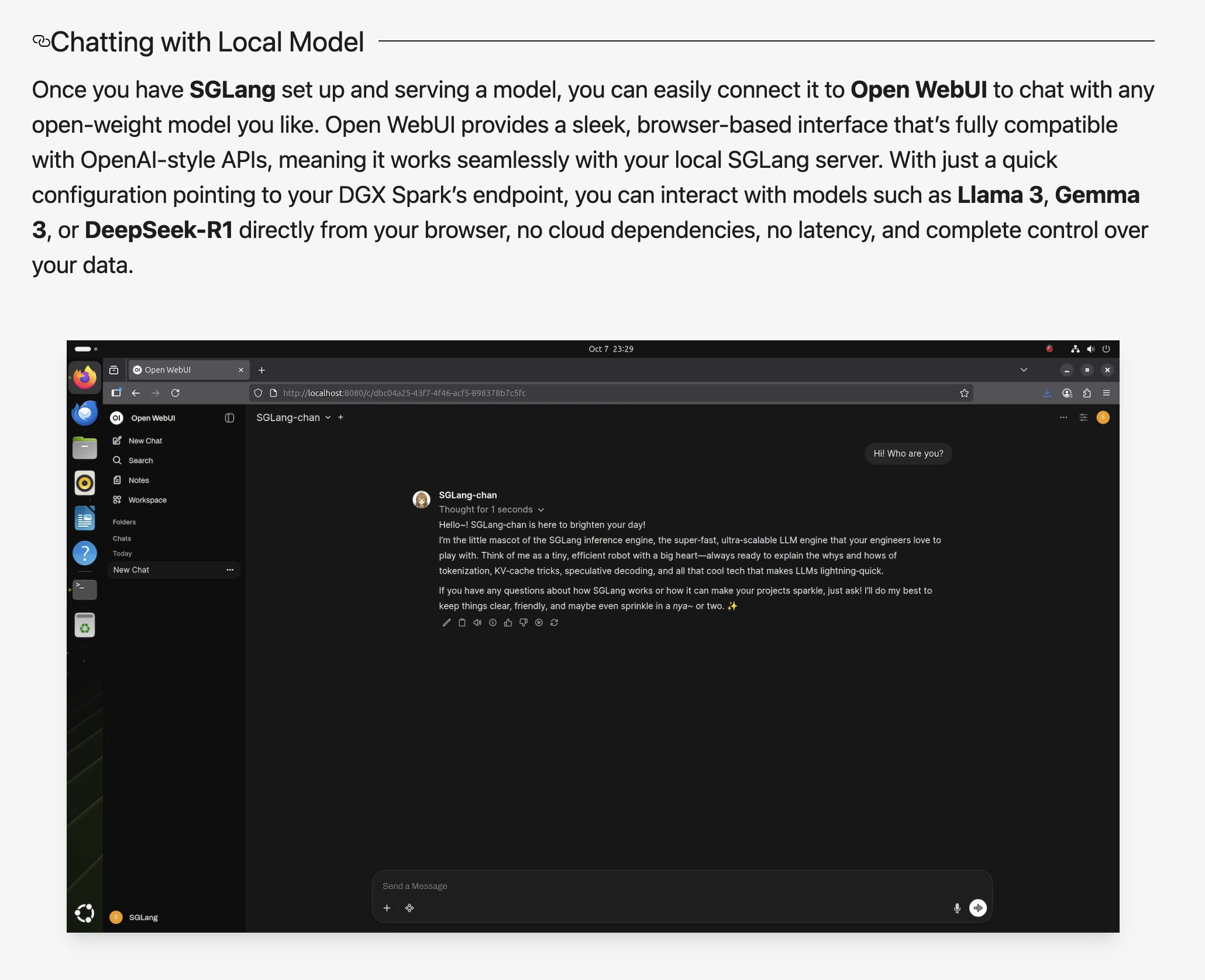 整个交互过程中不经过云,不需要账号,也无延迟抖动,也就是说 DGX Spark 不只是“算力盒子”,而已经是一个“类 ChatGPT 本地对话终端”。