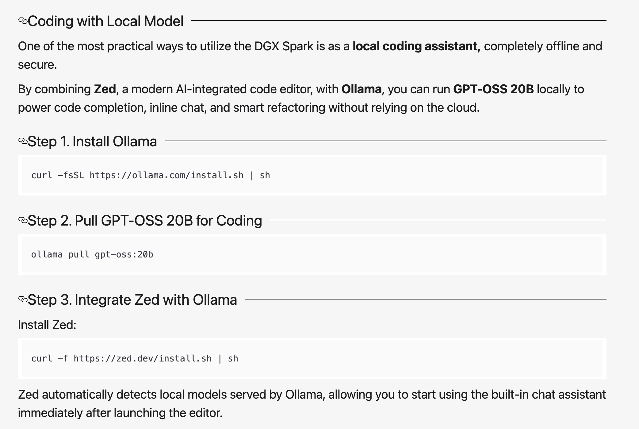 也就是说,DGX Spark 不只是能让你跑模型,还能直接成为“离线版 Copilot / Cursor 开发环境”,形成一个完整的个人 AI 工作流。