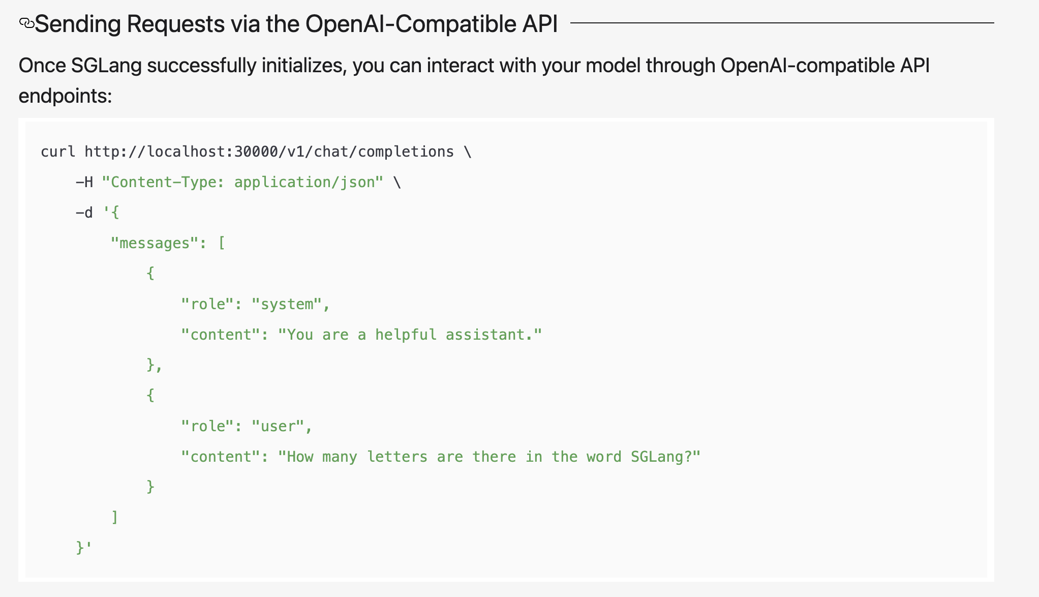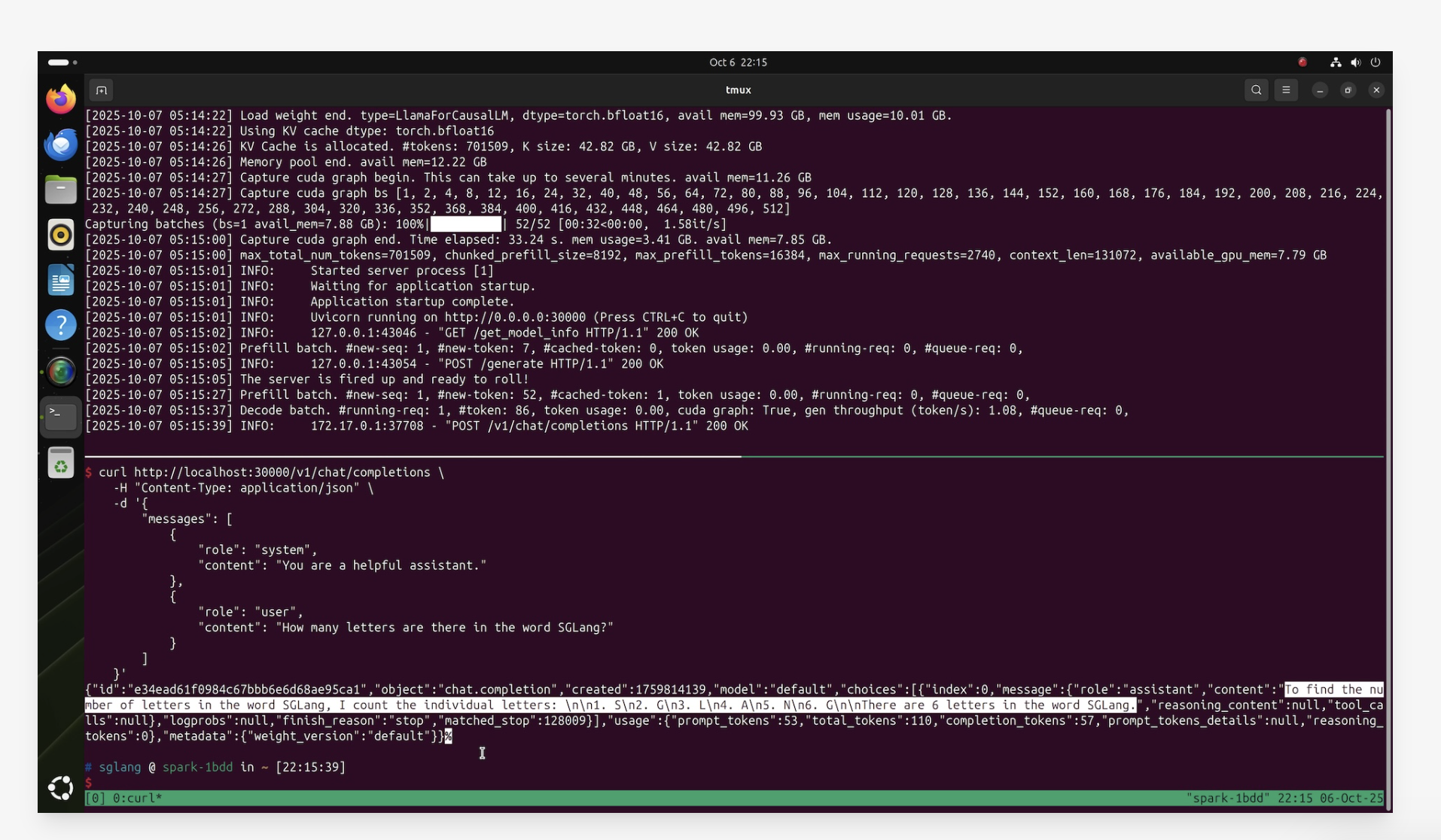 测试者首先通过 Docker 启动了 SGLang(SGLang 是 LMSYS 开发的一个专为本地大模型推理优化的高性能框架,能提供 OpenAI 接口形式的 API 服务),并直接加载 Llama 3.1 8B 模型。