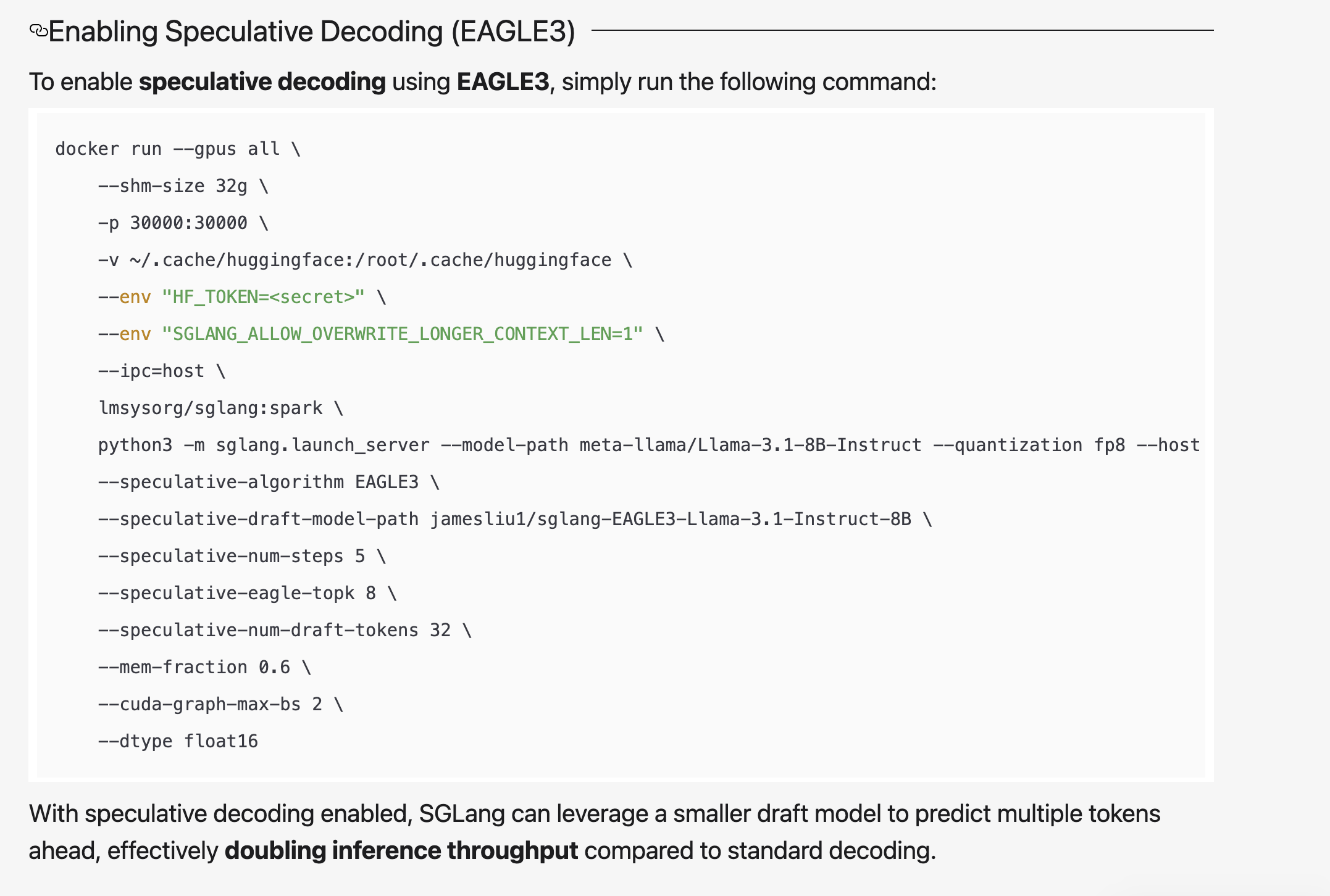 第二步:测试者启用了 Speculative Decoding(EAGLE3),这是目前高效推理框架正在使用的加速技术。如果 DGX Spark 只是能跑模型而缺乏调度和优化能力,这一步就会失败。