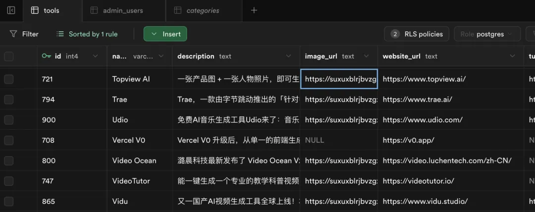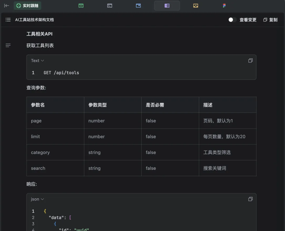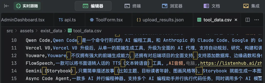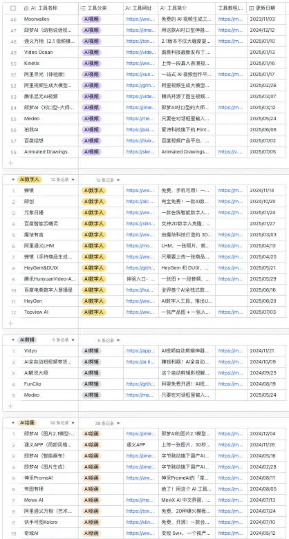 数据来源:为了简单,就直接用我之前维护的一份飞书文档来填充数据,里面有 200 多个 AI 工具及工具教程。