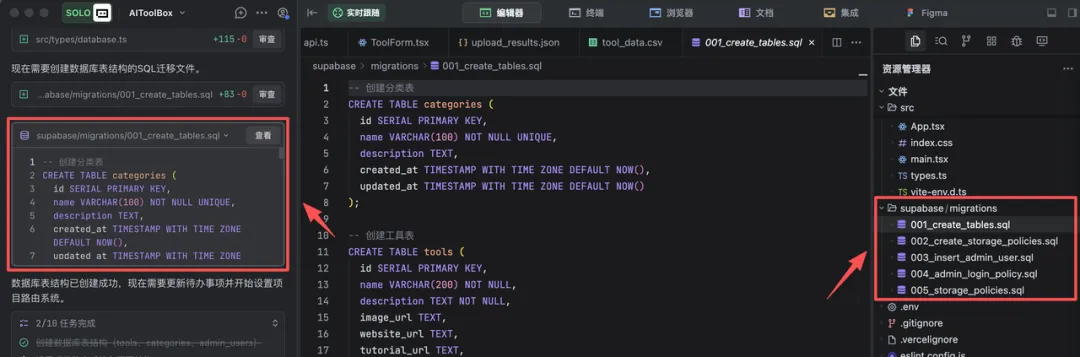比如,下面这些,建表、插入数据、添加策略、写批量插入数据的脚本啥的,完全不需要自己动手,TRAE 全部帮我们做了。