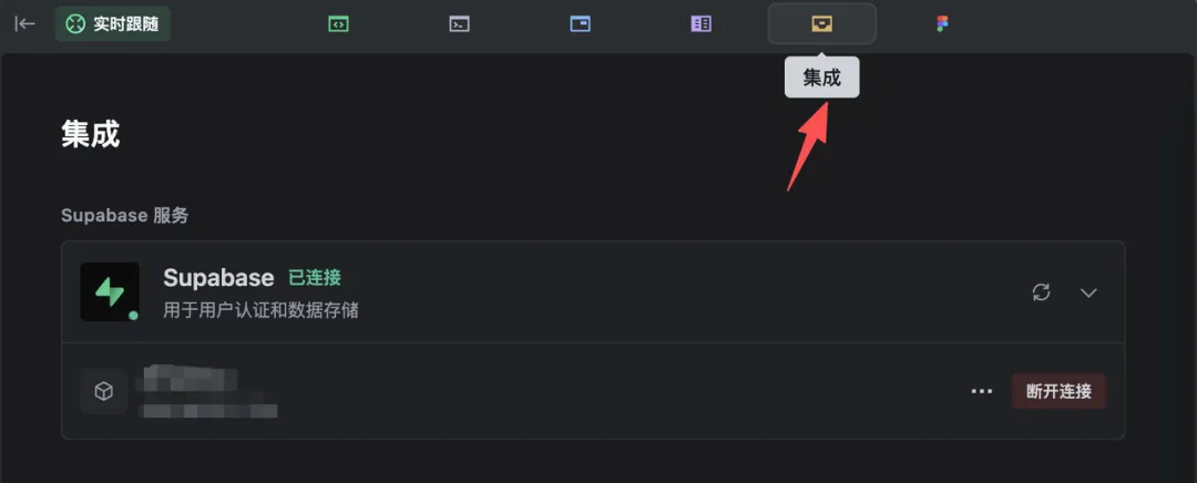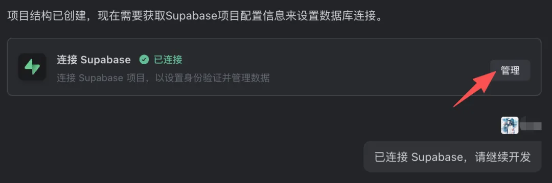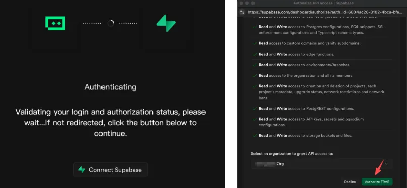 授权连接 Supabase、选择项目后,TRAE 就可以自动帮我们完成数据库建表、增删改查及用户认证等操作。