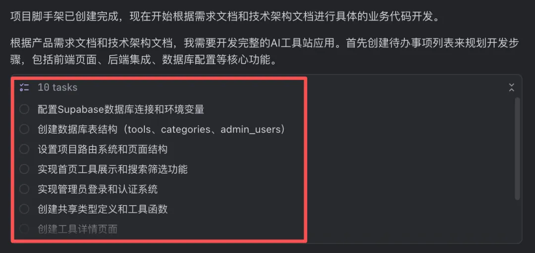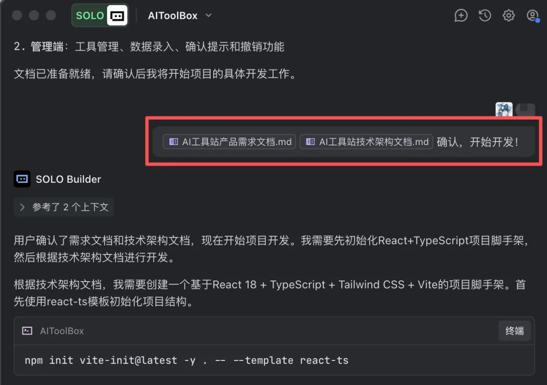 TRAE 先是根据技术架构文档,创建了项目的脚手架,并自动安装了所需的依赖包。