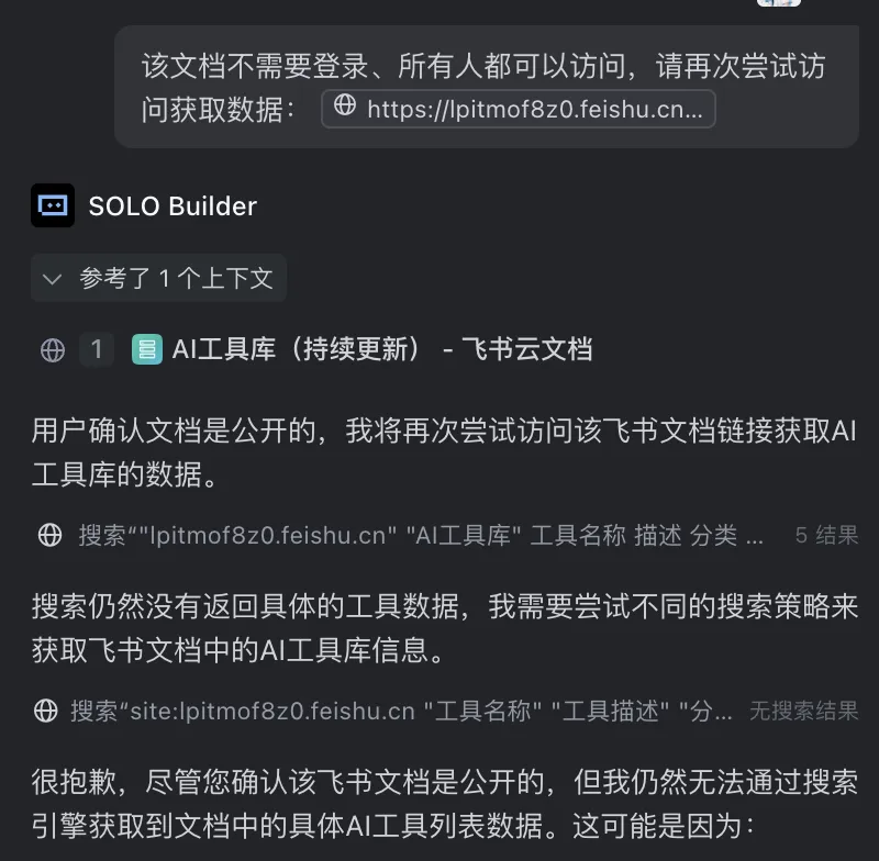 比如,在它一开始展示工具的时候,并没有用到飞书文档中提供的数据,而是自己随便拟了 5 个 AI 工具来展示。那么就可以继续追问。