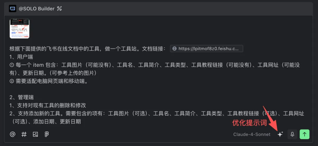我们只需要在对话框中简单描述下任务需求,点发送,就可以看 TRAE 帮我们干活了。你也可以通过上传图片或 Figma,来规定具体的样式。比如这里就简单上传了张草图,来描述每个 item 的大概样式。