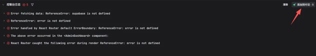 比如程序报错了,在控制台里点「添加到对话」,就可以一次性将多个报错信息告诉 TRAE,让它修复。