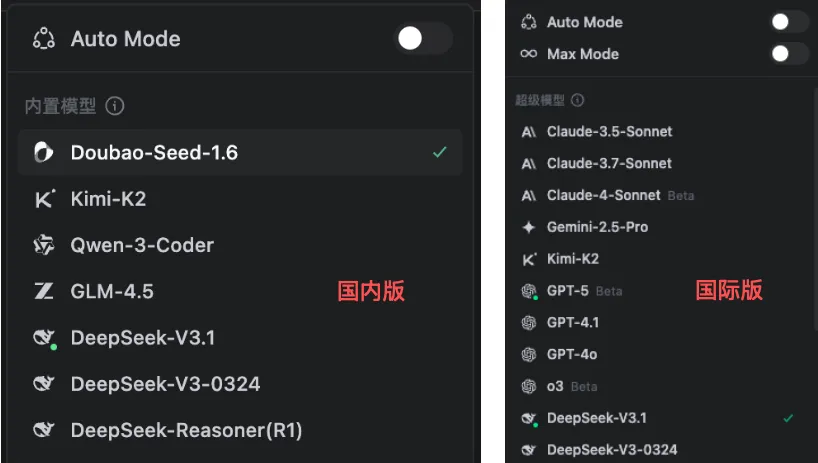 国内版的 TRAE 主要集成了豆包、Kimi、Qwen、GLM、DeepSeek 等国内主流的大模型,而国际版 TRAE 主要集成了 Claude、Gemini、GPT 等国际主流的一些大模型。
