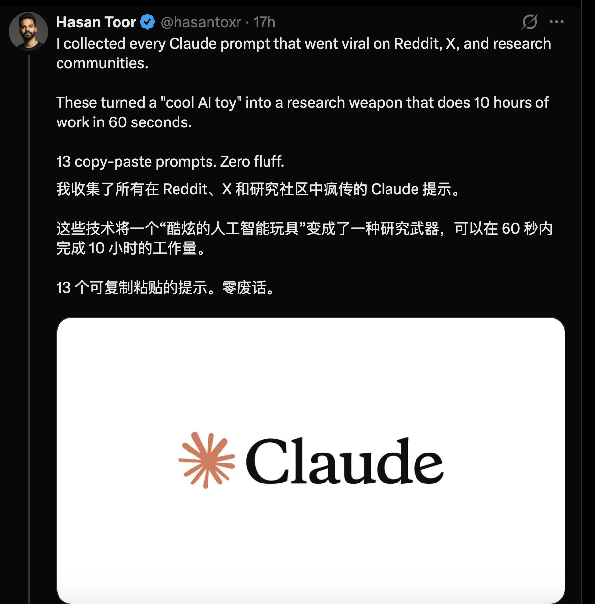 在帖子中,这位网友用了一种颇具传播性的说法来形容这些 Prompt 的效果——“可以在 60 秒内完成原本需要 10 小时的工作量”。尽管这一表述明显带有夸张成分,但并不妨碍该帖迅速在技术圈、研究圈和写作社区中被大量转发和收藏。