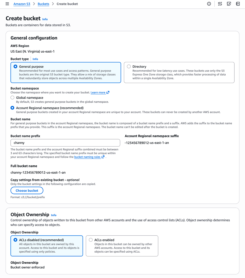 账户级区域命名空间改变了规则。现在,存储桶命名遵循 {前缀}-{账户 ID}-{区域}-an 的格式,其中 -an 表示账户级区域后缀。亚马逊云科技账户 123456789012 可以创建"mybucket-123456789012-us-east-1-an",而无需检查是否已被其他人占用。12 位账户 ID 充当了天然的分隔符,其他账户尝试使用完全相同的后缀时会被自动拒绝。