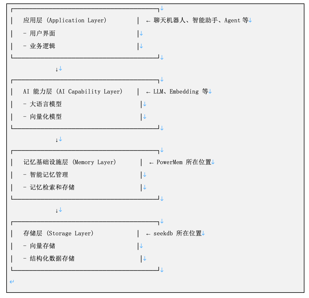 靖顺:PowerMem 位于 AI 应用的基础设施层(Infrastructure Layer),具体来说是记忆基础设施层。在典型的 AI 应用架构中,可以这样理解:
