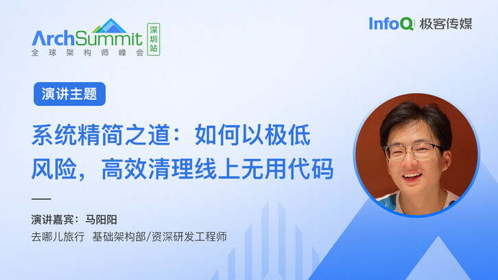 7 月 21 日 - 22 日, 在 ArchSummit 全球架构师峰会(深圳站),去哪儿旅行基础架构部资深研发工程师马阳阳,将于会上发表题为《系统精简之道:如何以极低风险,高效清理线上无用代码》的演讲,分享去哪儿网代码精简实践,让开发同学轻装上阵,减少系统债务、提升研发效能。