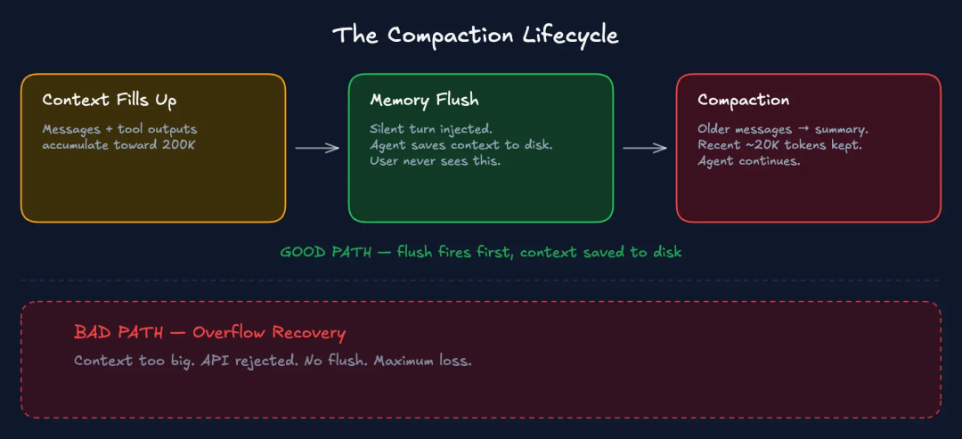 好路径:维护压缩。 上下文接近限值,预压缩记忆刷新首先启动。在压缩开始前,代理会自动将重要的上下文信息保存到磁盘。你看不到这个过程。然后,压缩操作会总结以前的对话历史。代理后续会使用这个摘要、用户最近发送的消息以及磁盘上的内容。