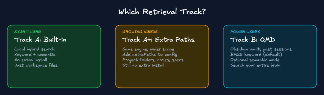 { "agents": { "defaults": { "memorySearch": { "enabled": true, "provider": "local", "extraPaths": [ "~/Documents/Obsidian/ProjectNotes/**/*.md", "~/Documents/specs/**/*.md" ] } } }}当你需要搜索大型库(数千个文件)、过去的会话记录或多个独立的集合时,可以升级到路径 B。