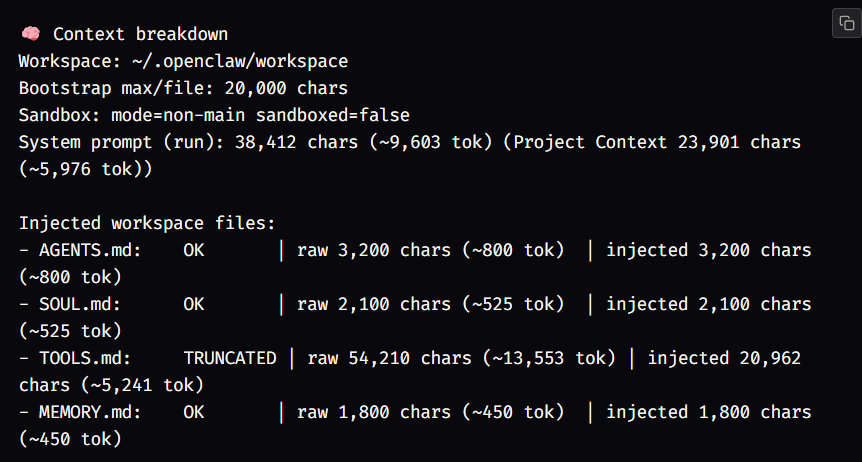 如果文件被截断,则调整配置中的字符数限制。每个文件的字符数限制为 bootstrapMaxChars(默认 20000)。总字符数限制为 bootstrapTotalMaxChars(默认 150000)。这两个参数是字符数量,而不是令牌数量——150000 个字符大约是 50K 令牌。