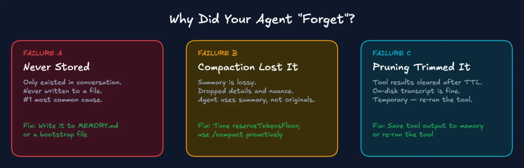 失败模式 A:“从未被存储。” 指令只存在于对话中,从未被写入文件。当压缩被触发或开启新会话时,它便消失了。这就是 Summer Yue 遭遇的情况。迄今为止,这是最常见的原因。