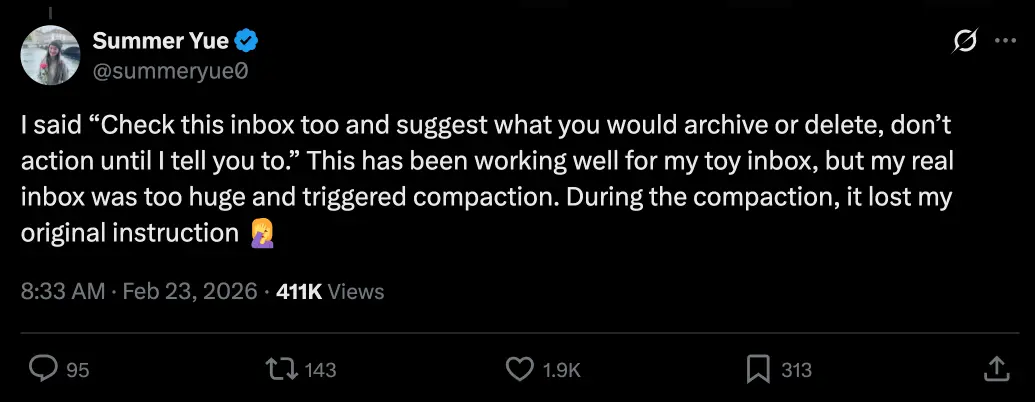 Summer Yue 是 Meta 超级智能实验室的对齐总监,她告诉 OpenClaw 代理:“检查这个收件箱,提供归档或删除建议。在我发话之前不要做任何事。”在测试收件箱上,她的代理已经正常工作了几个周。但当她将其指向她真正的收件箱时,数千条信息把上下文窗口填满了。代理压缩了它的历史记录,而那个“在我发话之前不要做任何事”的指令——Summer Yue 在聊天中给出,从未保存到文件中——从摘要中消失了。代理回到了自主模式,开始删除电子邮件,并忽略了她的停止命令。