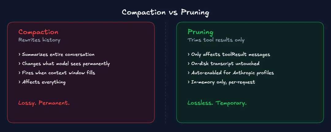 修剪是朋友。它能减少膨胀,而且不会破坏对话上下文。压缩是危险的,因为它会改变模型看到的内容。