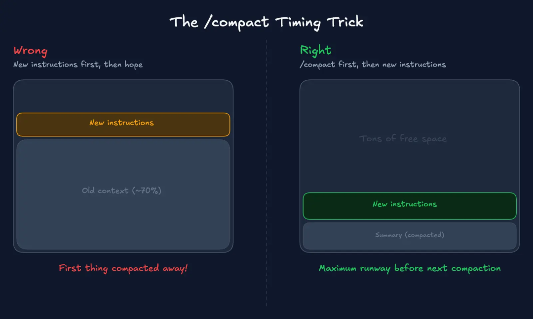 新指令会落在压缩后的新上下文中,它们有最大的生命周期。当下一次压缩来临时,它们不会是第一个因为生成摘要而损失掉的内容。
