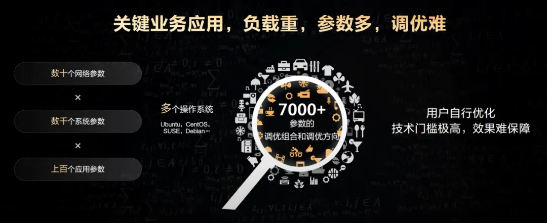 资源浪费只不过是表象罢了,更深层的问题体现为性能优化的复杂度。现实的业务部署不仅涉及操作系统选定,还包含网络参数、系统参数以及应用配置参数。数量往往达到数千级别,缺少专家经验积累,难以达成稳定的最优配置。单是内核跟应用层的参数组合,就已超出普通团队可控范围,调优所用的周期漫长,效果也难以把控。
