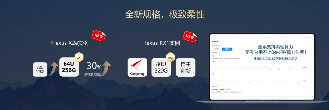 跟应用级优化同步进行的是,实例规模的进一步扩展。新一代 Flexus X2e 实例的 x86 规格从原本的 32U128G 提升至 64U256G,多核算力提升了约 30%;新增 Flexus KX1 鲲鹏实例,最高可达 80U320G,以覆盖大数据处理、内存数据库这类资源密集型场景。这意味着应用加速机制不再受中小规格环境约束,能在规模更大的资源池里发挥作用。