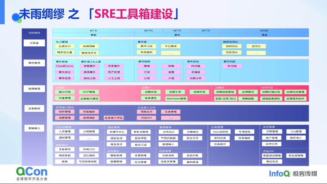 我们公司目前正在进行 SRE 工具箱建设。过去两年,公司投入大量时间和精力在 AIGC 业务上,但在稳定性建设方面的投入相对不足。这个工具箱建设的思路是基于故障生命周期,明确每个阶段需要做什么,以及平台需要具备哪些工具和能力来支撑这些工作。