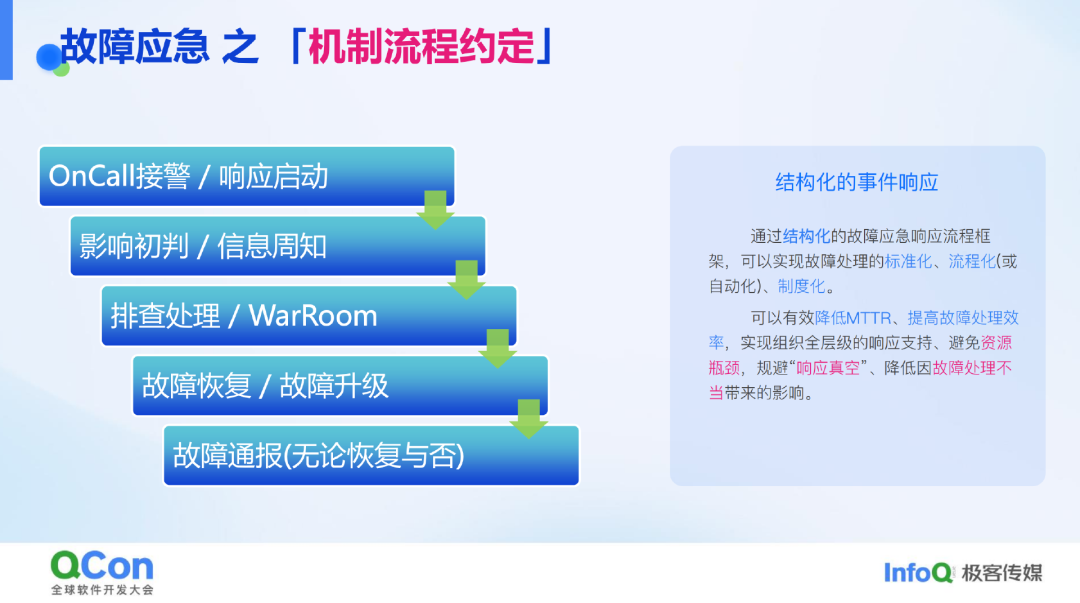 这种机制流程的设定有其理论支撑,是一种结构化的事件响应机制,旨在实现标准化和流程化。如果能通过平台覆盖整个事件响应和处理过程,甚至可以实现自动化。同时,需要形成制度,有效降低故障恢复时间,提高处理效率。这种机制还能在组织内部达成共识,便于在处理故障时整合更多资源,避免资源瓶颈和响应真空地带,减少因流程不合理带来的二次影响。